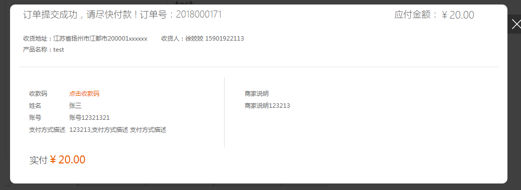 ③.pc前台页面预览:提交订单之后,会出现下方弹窗,展示了后台填写的相关收款信息